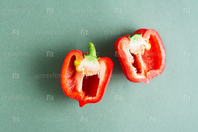 Спелый свежий красный перец разрезать пополам на зеленом фоне. Вегетарианская пища. Вид сверху