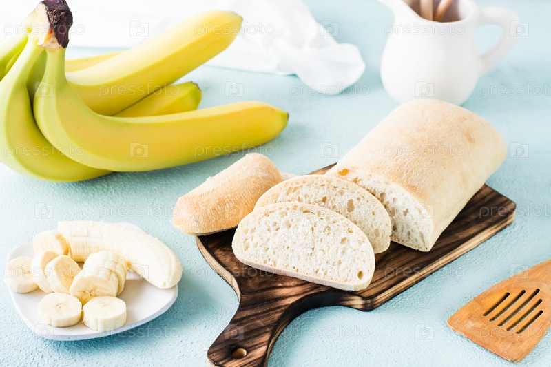 Свежий нарезанный банановый хлеб и бананы на тарелке на столе. Домашняя выпечка