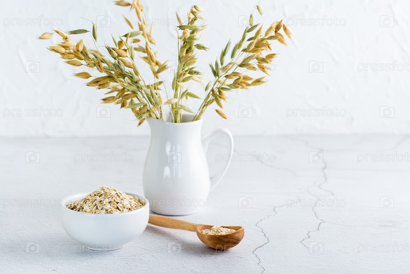 Сухая овсянка в миске, деревянной ложке и кувшине с ушами на светлом столе. Домашнее здоровое питание