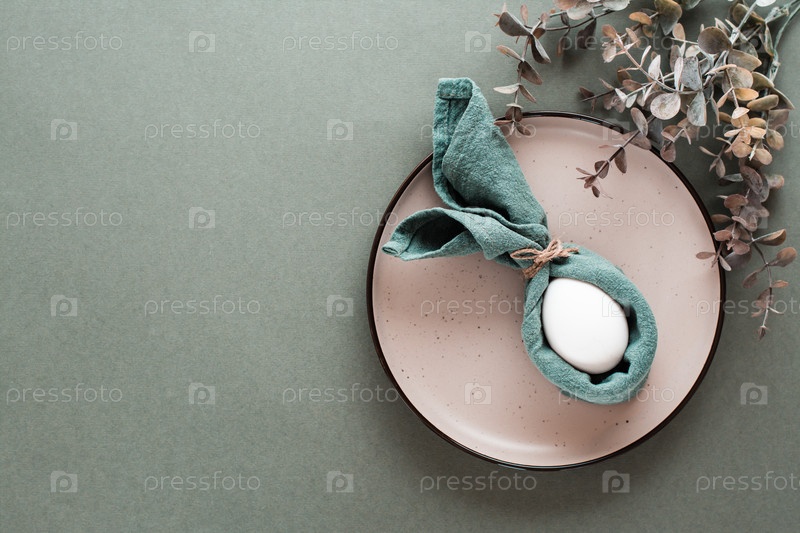 Белое куриное яйцо завернуто в салфетку в виде кролика на тарелке и ветки эвкалипта на зеленом фоне. Экологически чистая счастливая пасха. Вид сверху