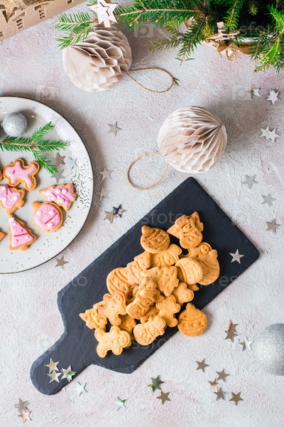 Свежеиспеченное рождественское печенье сложено на грифельной доске на украшенном столе. Праздничное угощение. Верхний и вертикальный вид