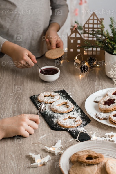 Дети смазывают печенье Linzer ягодным джемом на кухонном столе. Приготовление новогодних угощений. образ жизни. Вертикальный вид