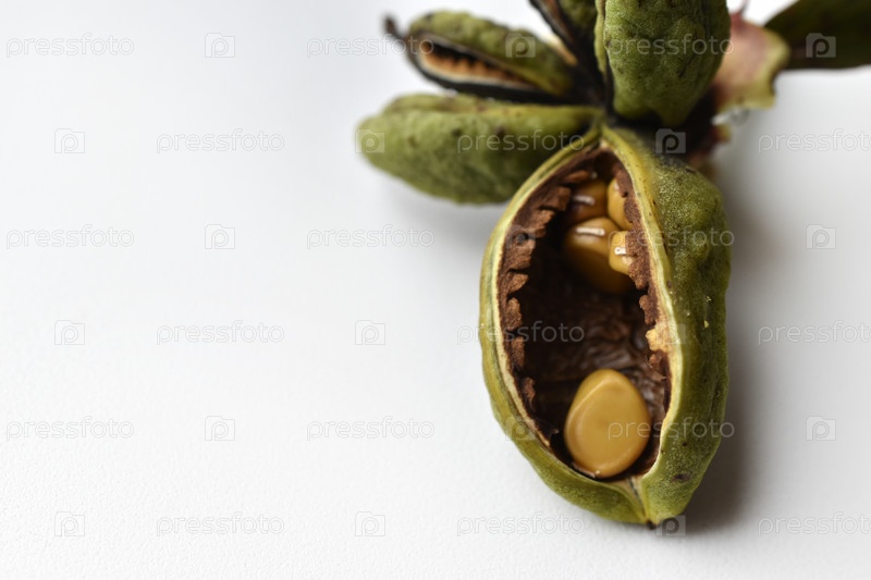 Семена пиона в зеленых корзинах на белом фоне. Семена цветов в корзинах