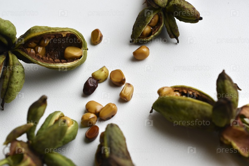 Семена пиона в зеленых корзинах на белом фоне. Семена цветов в корзинах