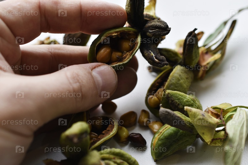Семена пиона в зеленых корзинах на белом фоне. Семена цветов в корзинах