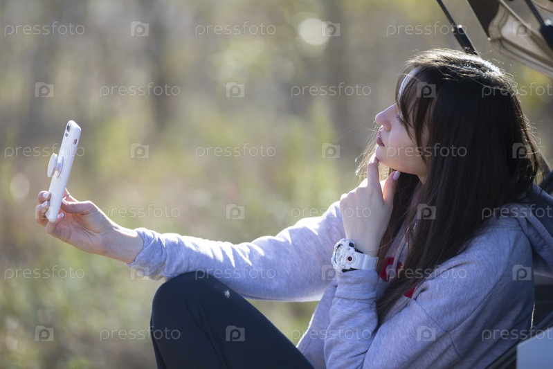 Портрет красивой девушки на улице, которая пользуется смартфоном, делится друг с другом цифровым контентом и любит делать селфи