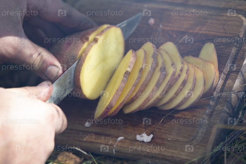 Руки режут картошку для гриля. Приготовление пищи на природе