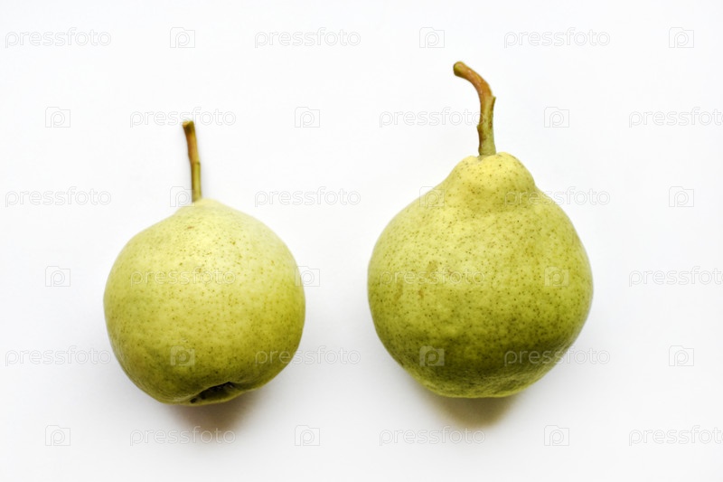 Две зеленые спелые груши на белом фоне осенью. Два плода зеленой груши крупным планом