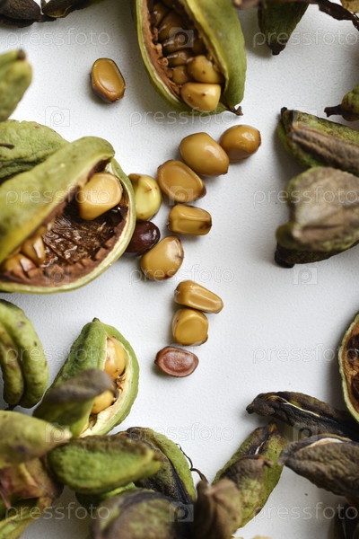 Семена пиона в зеленых корзинах на белом фоне. Семена цветов в корзинах