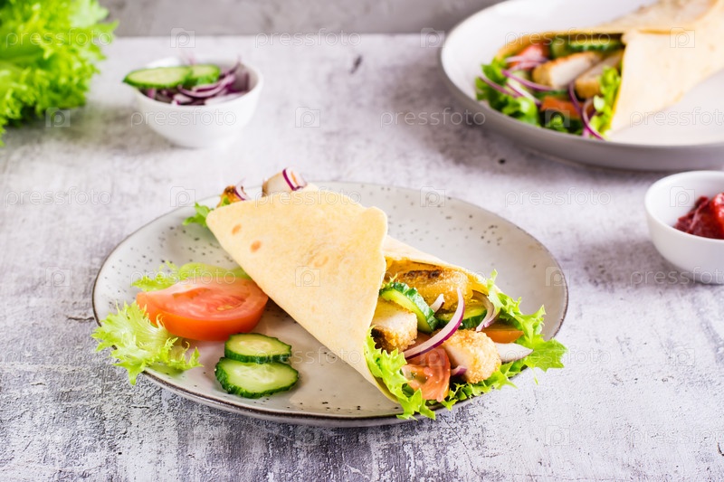 Тортилья с огурцом, курицей и помидорами на тарелке на столе. Мексиканская кухня