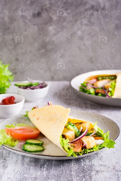 Мексиканские лепешки с овощами и курицей на тарелке на столе. Вертикальный вид