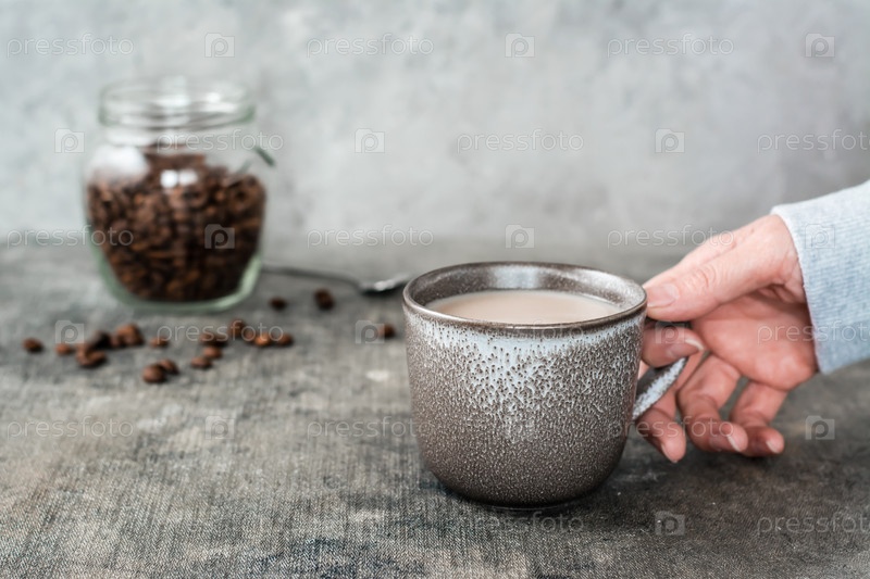 Латте в керамической чашке в женских руках и банка кофейных зерен на столе
