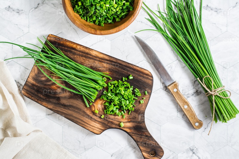 Нарезанный свежий зеленый лук на разделочной доске на столе. Весенний сбор витаминов. Вид сверху