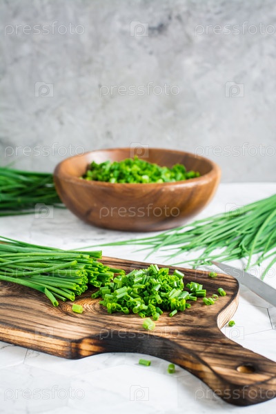 Нарезанный свежий зеленый лук на разделочной доске на столе. Вертикальный вид. Копировать пространство