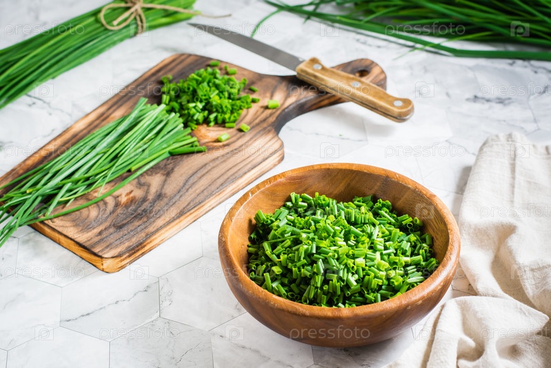 Свежий нарезанный зеленый лук в деревянной миске и разделочной доске на столе. Витаминно-травяная диета