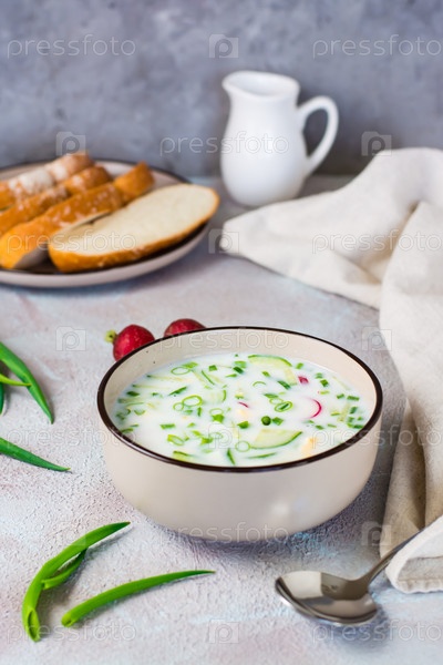 Аппетитный традиционный русский холодный суп с овощами и кефиром в миске. Вертикальный вид