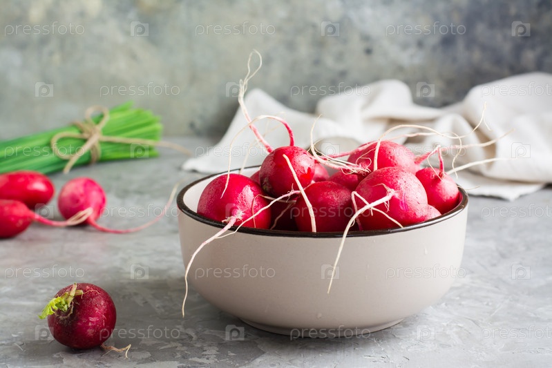 Свежая целая редька в миске на столе. Вегетарианская витаминно-овощная диета