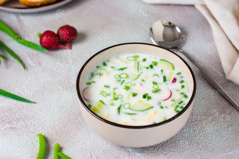 Готов съесть традиционный русский холодный суп в миске. Домашняя еда