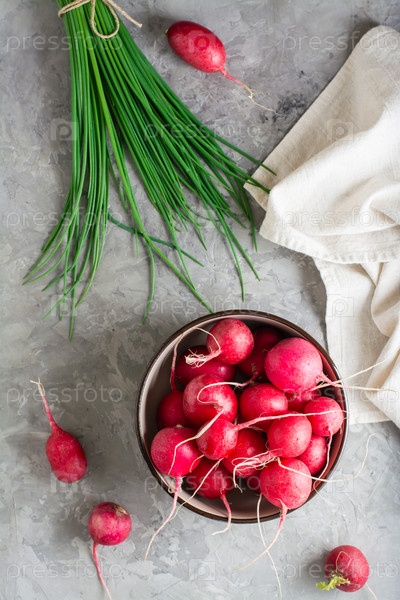 Свежий цельный редис в миске и пучок зеленого лука на столе. Верхний и вертикальный вид