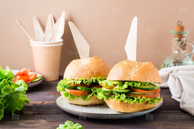 Вегетарианский бургер со свежими овощами и салатом в булочке с кунжутом на тарелке