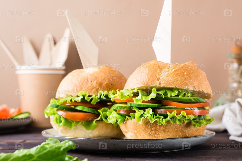 Вегетарианский бургер со свежими овощами и листьями салата в булочке с кунжутом на тарелке. Крупный план