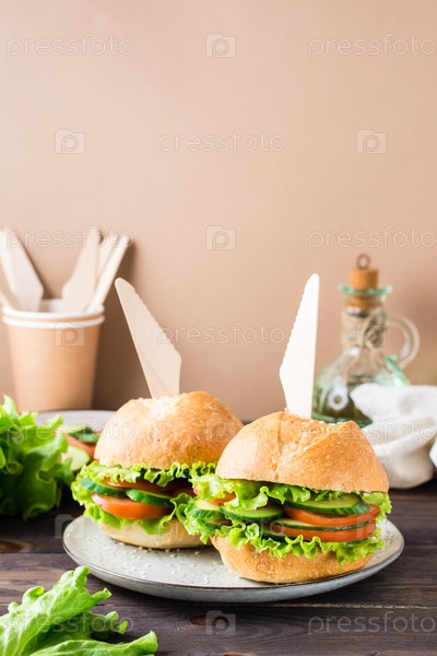 Вегетарианский бургер со свежими овощами и листьями салата в булочке с кунжутом на тарелке. Вертикальный вид