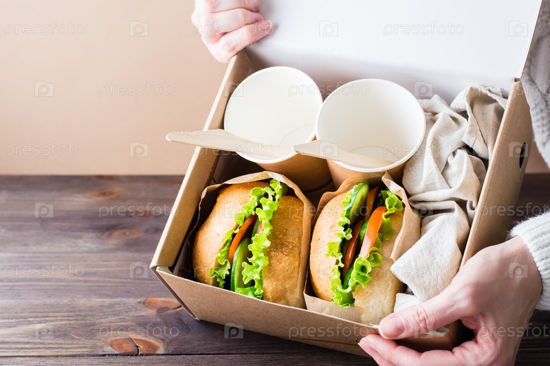 Вегетарианские гамбургеры со свежими овощами и салатом в булочке в коробке в женских руках