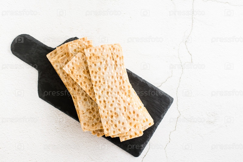 Тонкий хрустящий зерновой хлеб на грифельной доске на столе. Здоровая пища. Вид сверху