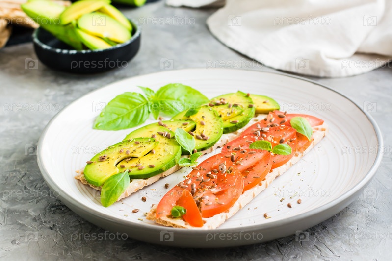 Аппетитная брускетта с авокадо и помидорами на зерновом хлебе на тарелке на столе