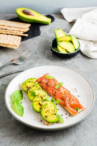 Аппетитная брускетта с авокадо и помидорами на зерновом хлебе на тарелке. Вертикальный вид