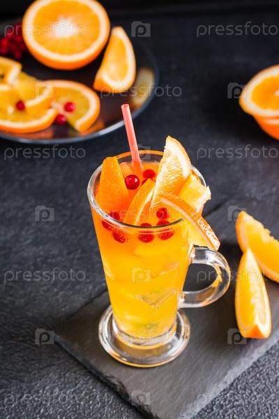 Апельсиновый клюквенный шипучий коктейль в стакане и фрукты и ягоды рядом на доске на темном фоне. Моктейль домашний. Вертикальный вид