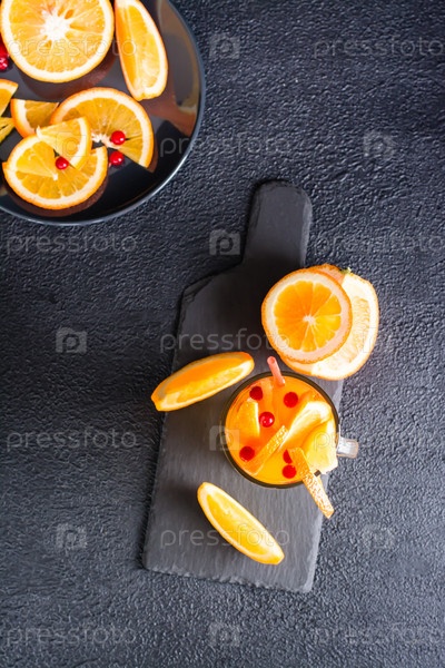 Апельсиновый клюквенный шипучий коктейль в стакане и фрукты и ягоды рядом на доске на темном фоне. Моктейль домашний. Верхний и вертикальный вид