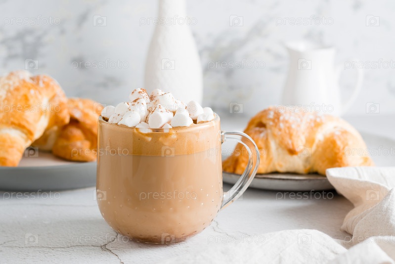 Вкусный кофе с зефиром и круассанами на тарелках на столе. Домашняя закуска в стиле лайфстайл. Крупный план
