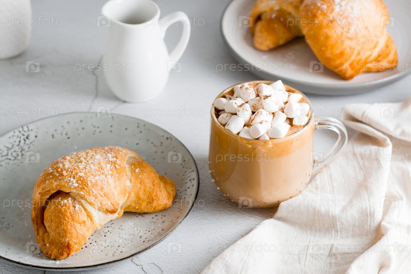 Чашка кофе с зефиром и круассанами на тарелках на столе. Образ жизни с домашним завтраком