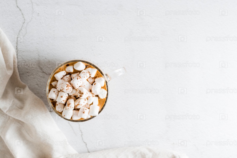Вкусный кофе с зефиром в чашке на столе. Домашний отдых в стиле лайфстайл. Вид сверху. Копировать пространство