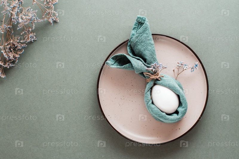 Белое куриное яйцо завернуто в салфетку в виде кролика на тарелке и гипсофилы на зеленом фоне. Экологически чистая счастливая пасха. Вид сверху