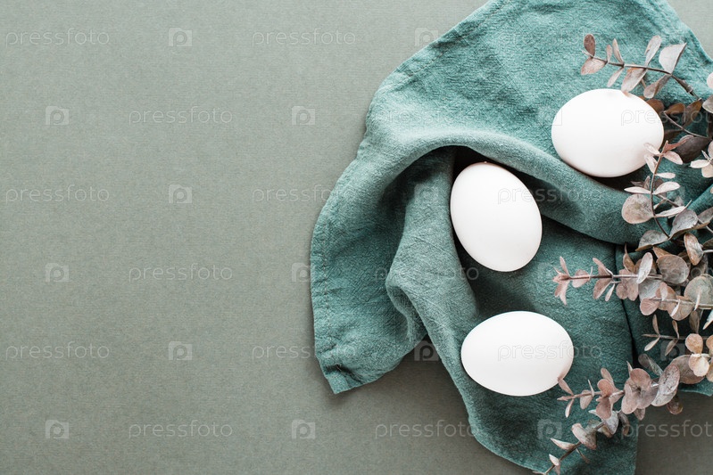 Белые куриные яйца на льняной салфетке и ветка эвкалипта на зеленом фоне. Экологически чистая счастливая пасха. Вид сверху