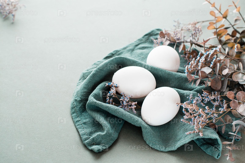 Белые куриные яйца на льняной салфетке и ветка эвкалипта и гипсофилы на зеленом фоне. Экологически чистая счастливая пасха
