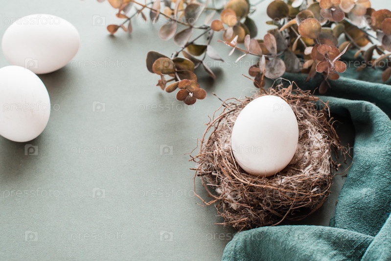 Белое куриное яйцо в гнезде на льняной салфетке и ветка эвкалипта на зеленом фоне. Экологически чистая счастливая пасха