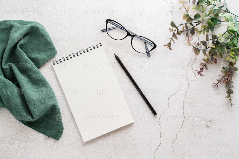 Блокнот для письма, карандаш, очки и ветка эвкалипта на светлом текстурированном фоне. Планирование и организация. Вид сверху