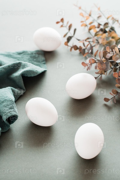Белые куриные яйца, льняная салфетка и ветка эвкалипта на зеленом фоне. Экологически чистая счастливая пасха. Вертикальный вид