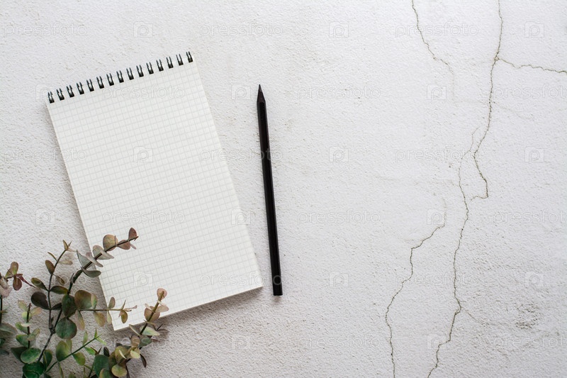 Блокнот для письма, карандаш и ветка эвкалипта на светлом текстурированном фоне. Планирование и организация. Вид сверху. Копировать пространство