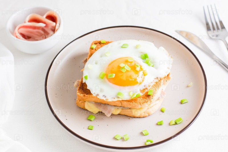 Сэндвич Croque Madam с сыром, беконом и яйцом на тарелке на светлом столе