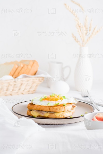 Croque Madam - французский бутерброд с сыром, беконом и яйцом на тарелке на светлом столе. Домашний завтрак. Вертикальный вид
