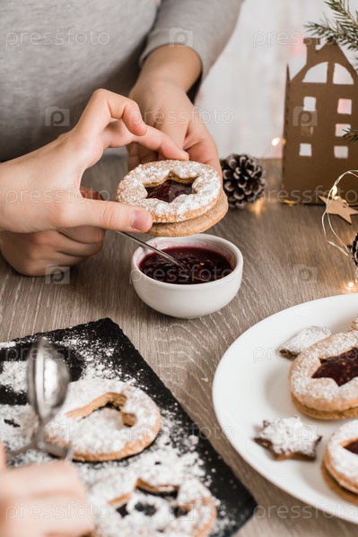 Детские руки складывают печенье Linzer с ягодным джемом на кухонном столе. приготовление новогодних угощений. образ жизни