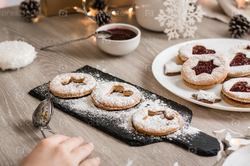 Налейте на кухонный стол печенье Linzer с сахарным порошком. Рождественские угощения. образ жизни