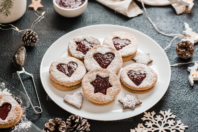 Готовые печенье Linzer с ягодным джемом на тарелке на темном фоне. Приготовление новогодних угощений. Образ жизни. Большой план