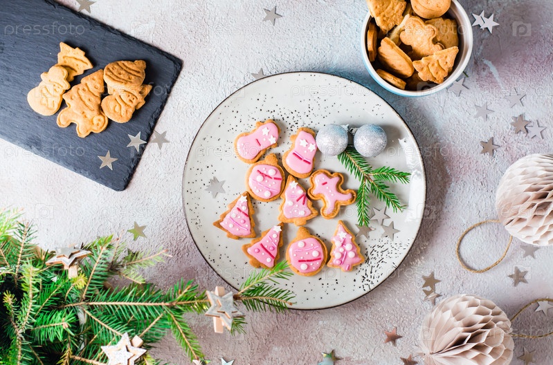 Свежеиспеченное рождественское печенье с розовой глазурью на тарелке на украшенном столе. Праздничное угощение. Вид сверху