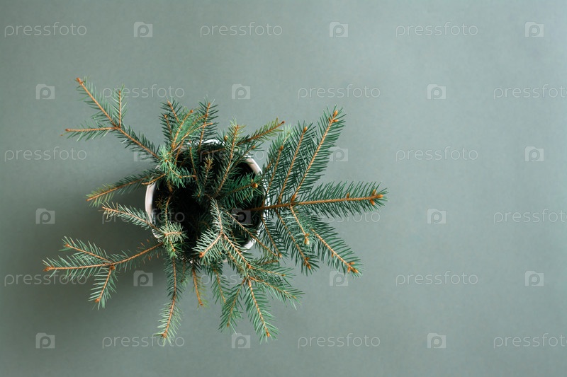 Концепция зеленая. Букет еловых веток в горшке на зеленом фоне