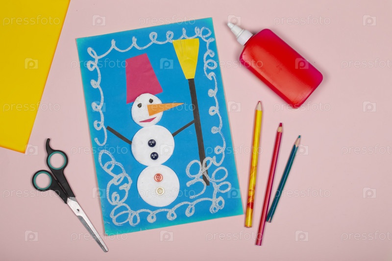 Детские новогодние поделки из бумаги. Применение детского творчества. Детский сад и школа ремесел. На бежевом фоне снеговик из цветной бумаги